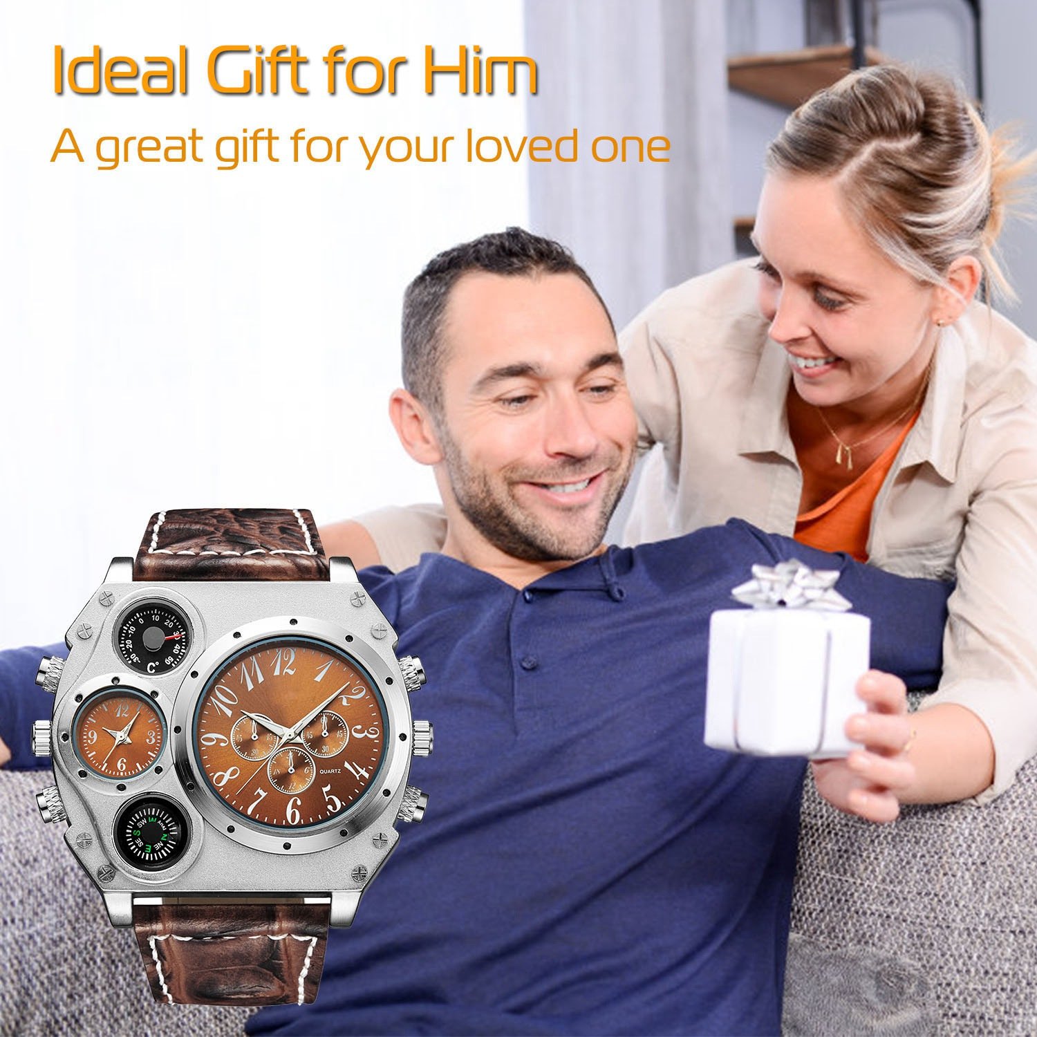 *Stylish Big Face*:Features large face including large time dial,small time dial,compass dial(decoration) and thermometer dial(decoration) to offer you a unique style watch.