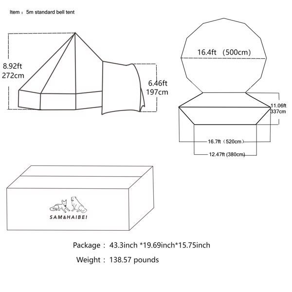 • [Perfect for Family Camping] – The 4M canvas tent bell tent has a diameter of 13 feet, a peak height of approximately 8 feet, and side wall height of 1.9 feet, providing ample space for 2-4 people and allowing you to stand inside. The 5M bell tent measures 16.5 feet in diameter, with a height of up to 9 feet and a sealed bottom perimeter that is insect-proof, making it perfect for family camping.