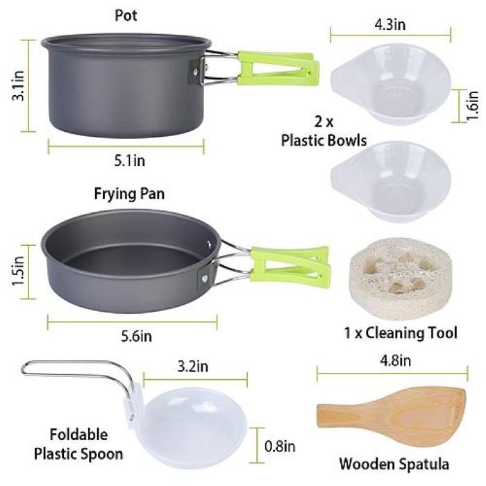 9Pcs Outdoor Cooking Set: This package contains 1 pot(1.3L), 1 pan(0.7L), 1 lid, 2 bowls, 1 spoon, 1 spatula, 1 cleaning tool, and 1 storage bag. You can find everything you need for outdoor cooking in this small package.