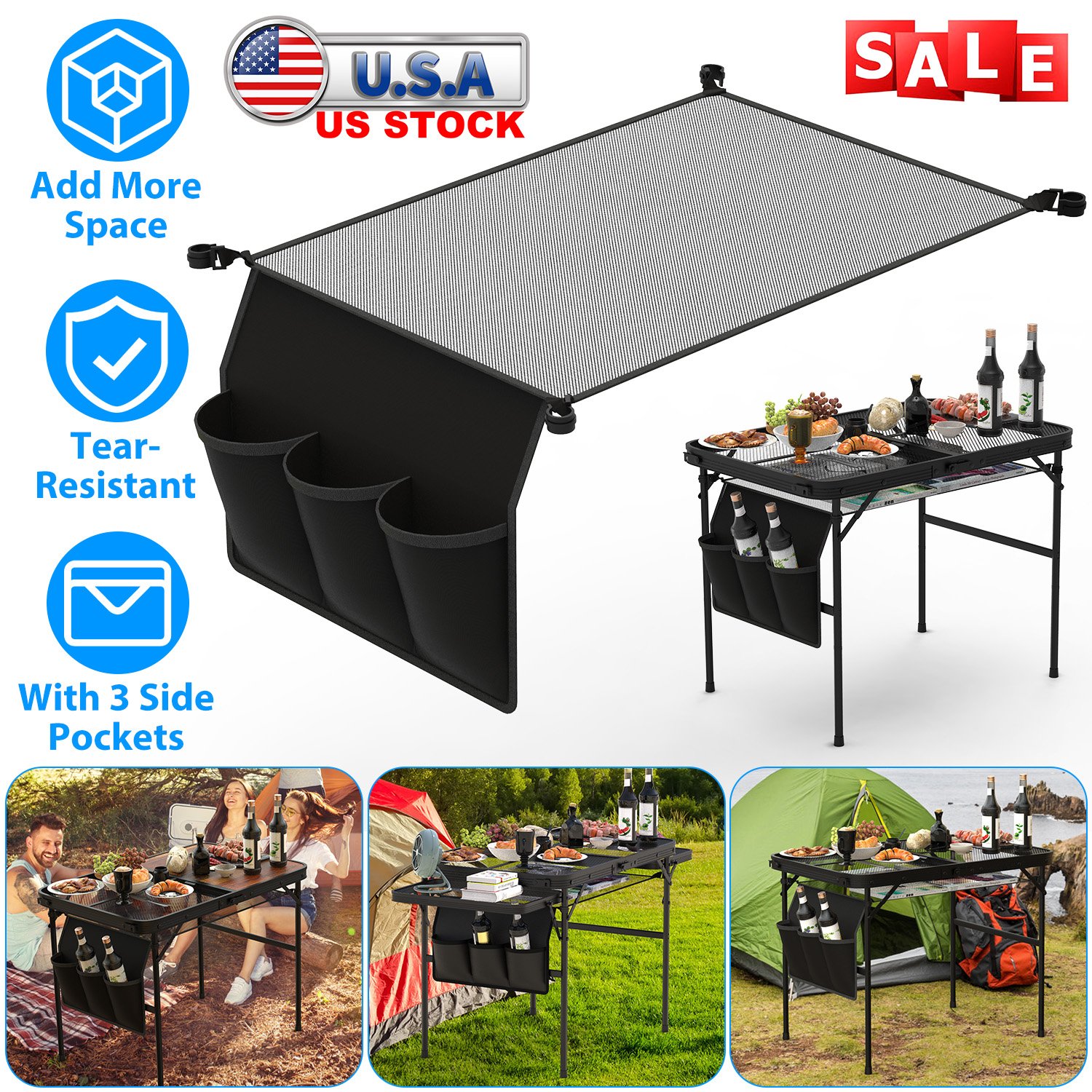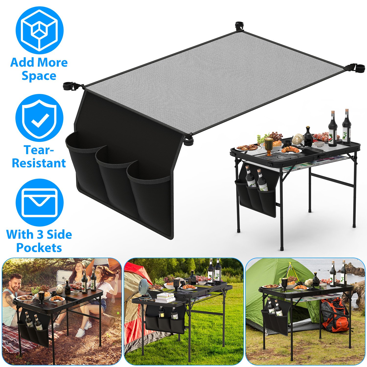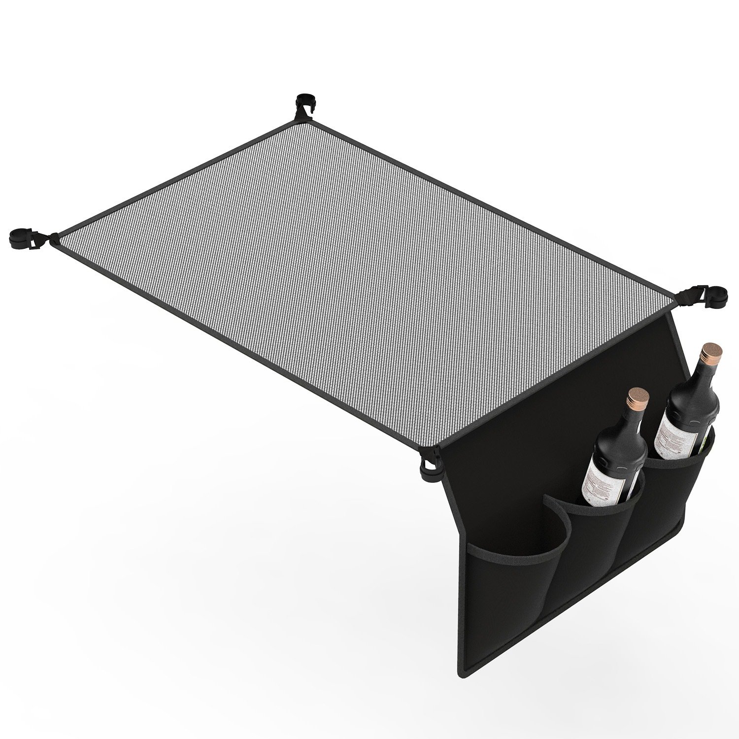 Our under table hanging storage net quipped with 4 clips is specially designed for 35.43x23.62 camping table with 0.89in-diameter side pole. Great to add more space for your table when you’re camping, hiking, fishing or other outdoor activities. 29.53x19.69in Net is able to hold your snacks, cookies, magazines and the 3 side pockets are perfect to hold your water bottles, beverage and umbrella. It’s easy to set up with seconds.