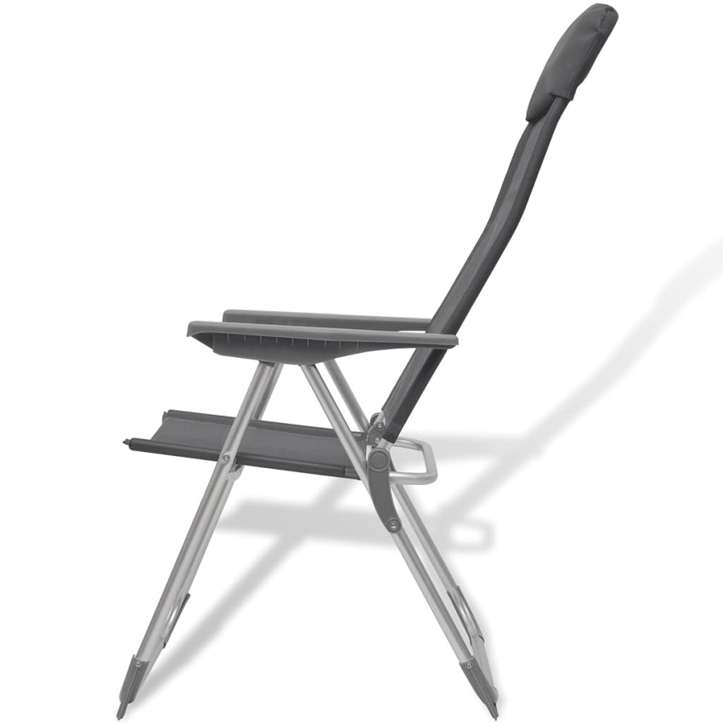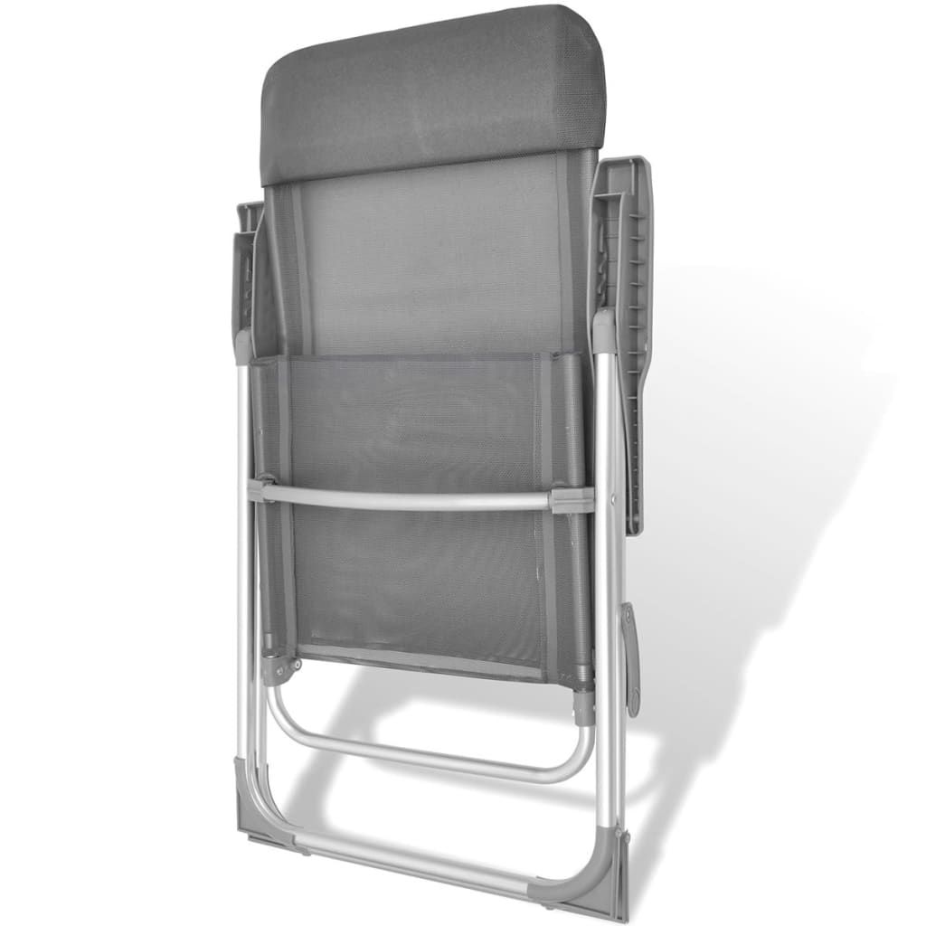 This aluminum camping chair set. including 2 pcs. will be ideal for hunting. camping. fishing. traveling and other outdoor activities. The chairs can be adjusted in 5 positions and have a soft. foam-padded headrest. Since it is light in weight. the chair set can be easily moved around as needed. In addition. the chair set can be easily folded when not in use for easy transport and storage. Thanks to a sturdy structure. this camp chair set is durable and stable. The compact chairs can support weights of up to 264.55 lb. The high-quality textilene cover makes the chair set hard-wearing. Delivery includes 2 aluminum camping chairs.Color: GrayMaterial: Aluminum frame + textilene coverSize: 22" x 23.6" x 44.1" (W x D x H)Load capacity: 264.55 lbFinish: Anodized. to make it rot resistantWith a comfortable headrest padded with foamCan be adjusted in 5 positionsFoldable for easy transport and storageDelivery includes 2 camping chairsFabric: Polyester: 30%. PVC: 70%