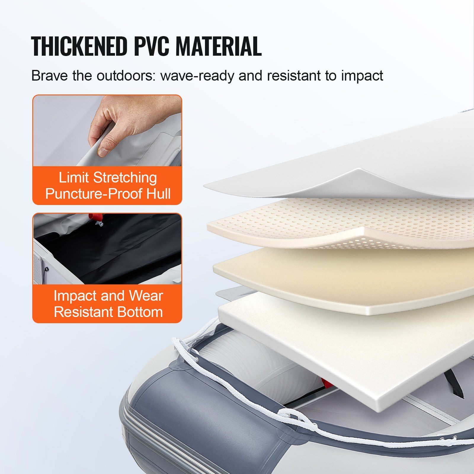 Upgraded thick PVC material, coupled with aluminum benches and marine wood bottom floor, prevents sagging and instability, ensuring the inflatable boat's longevity in marine conditions. Independent 4 air chambers enhance safety, maintaining buoyancy even if one chamber is compromised.