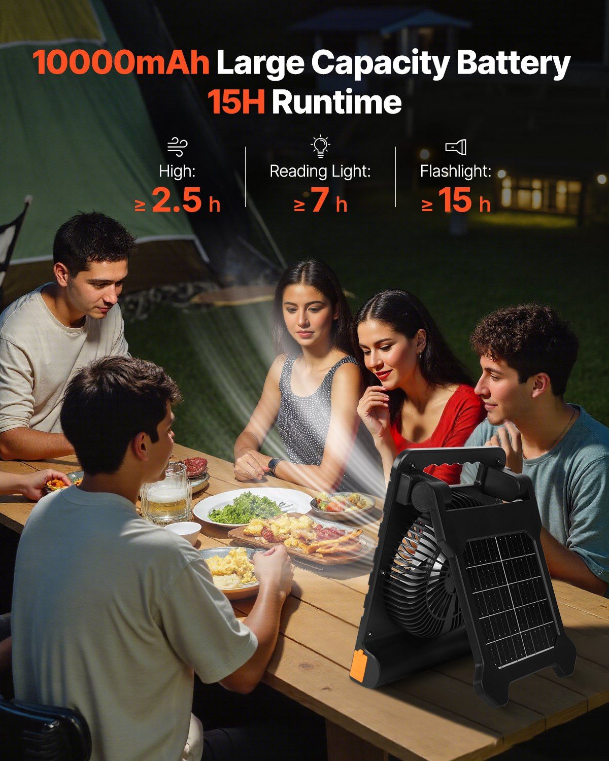 1.10000mAh Large Capacity: The flashlight mode can run continuously for 15 hours, high-speed fan mode lasts 2.5 hours, and light mode can be used for 7 hours, meeting the needs of various outdoor scenarios