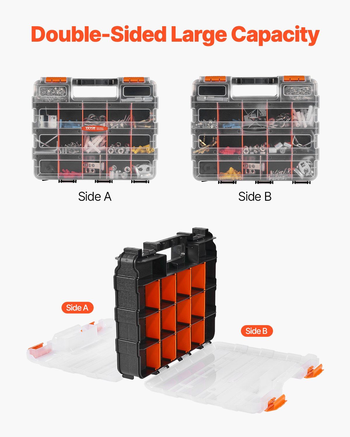 2.Double-Sided Large Capacity: Our tool organizer box offers double-sided storage, maximizing space and efficiency. Whether it's electrical connectors, bolts, screws, small parts, fishing tackles, or crafts, both sides are designed to keep your items neatly arranged and easily accessible.