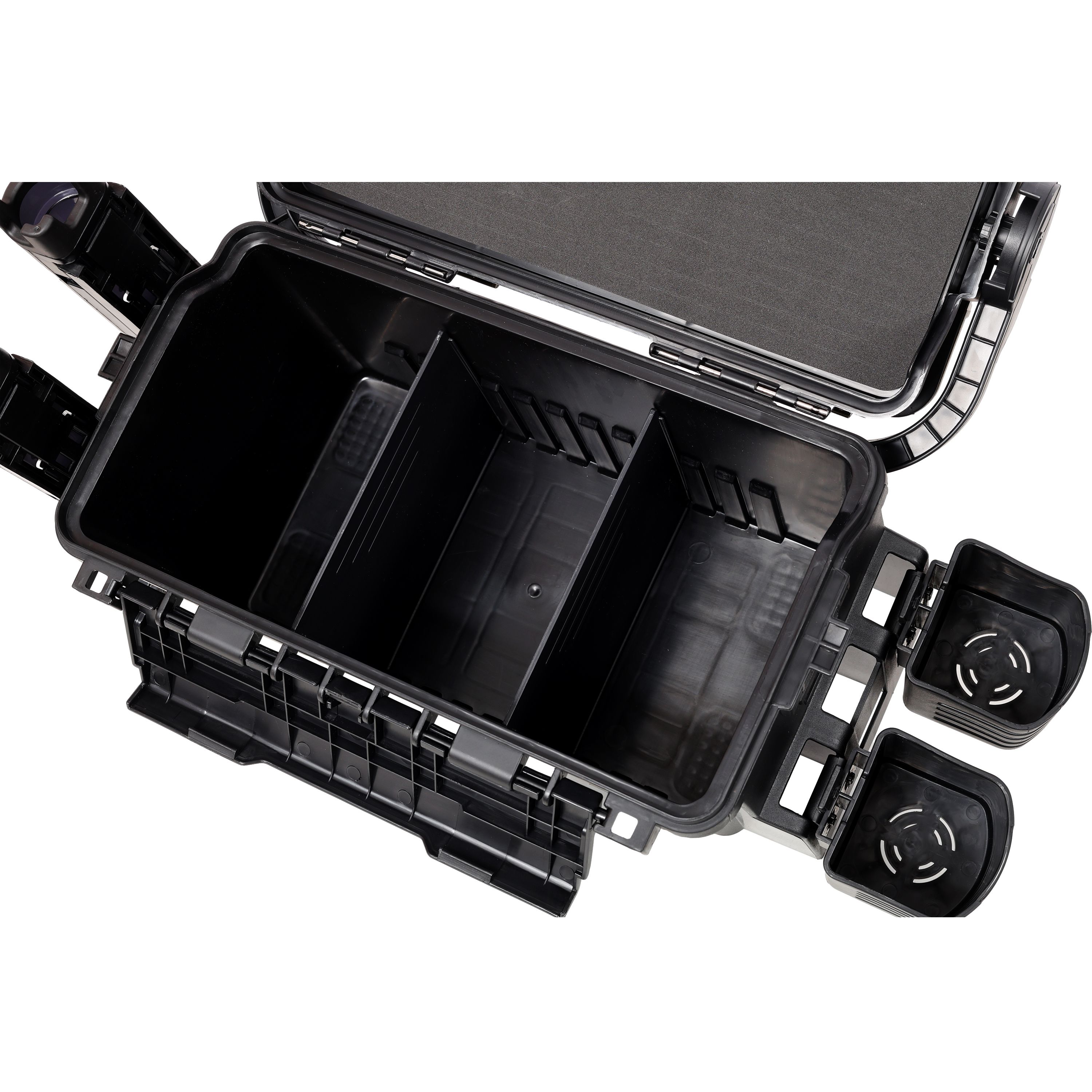 Tackle Box Large: Comes with 1pc 2 layer fishing tackle box, inside with additional accessories - 1pc carrying strap, 2pcs black cup holders, 2pcs black rod rack holders with split structure.