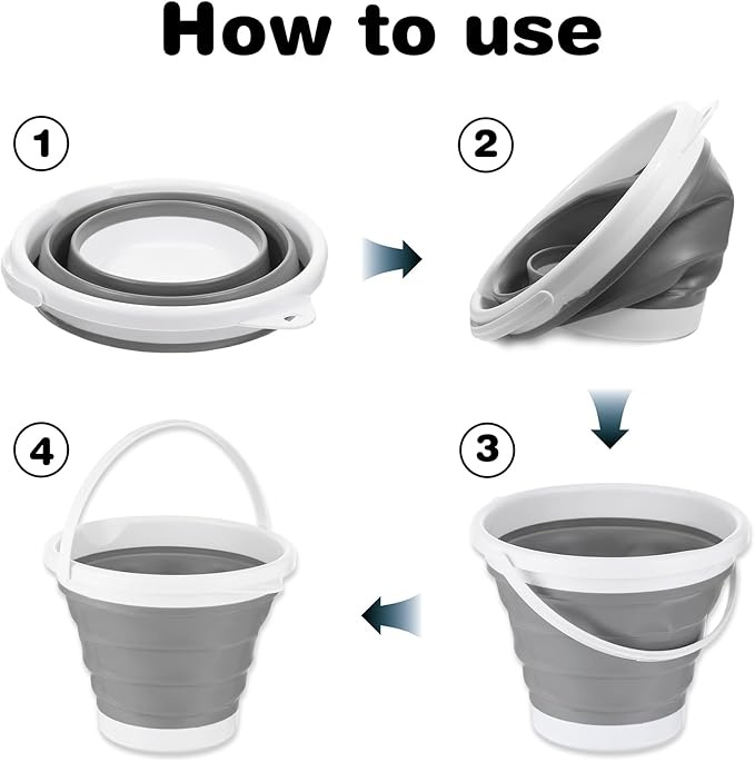 [High-quality materials]Collapsible buckets are made of high-quality plastic and rubber, and mop buckets are BPA-free, safe and durable. Car wash buckets are sturdy in structure, with excellent stability and wear resistance, cleaning buckets have a long service life, and fishing buckets are ideal for heavy-duty use[Space-saving]Water buckets are 12.6 inches (32cm) in diameter and 9.84 inches (25 cm) in height before folding, and buckets with handles can be easily folded to only 1.97 inches (5 cm) high. Sauna buckets save 75% of space by folding and storing, and bait buckets easily fit into small spaces[Versatile use]Bucket for cleaning is perfect for a variety of activities. Collapsible basins can be used for home cleaning, gardens, kitchens, laundry rooms, garages, camping, and fishing. Collapsible mop buckets can also be used as laundry baskets, beach toys, and even ice buckets for parties[Convenient design]Ice buckets for parties have sturdy ergonomic handles, and car cleaning buckets are easy to carry when full. The foldable bucket also includes a hanging ring for convenient storage. The grooves on the bottom of the folding bucket make pouring easy[Household Essentials]You will get 2 pieces of collapsible buckets with handles. The swamp bucket locks in place when in use to prevent spills. The collapsible wash basin is perfect for home, camping, parties, bathrooms, pet food scoops or dishwashing supplies, etc. The portable beach bucket is an indispensable accessory for your home