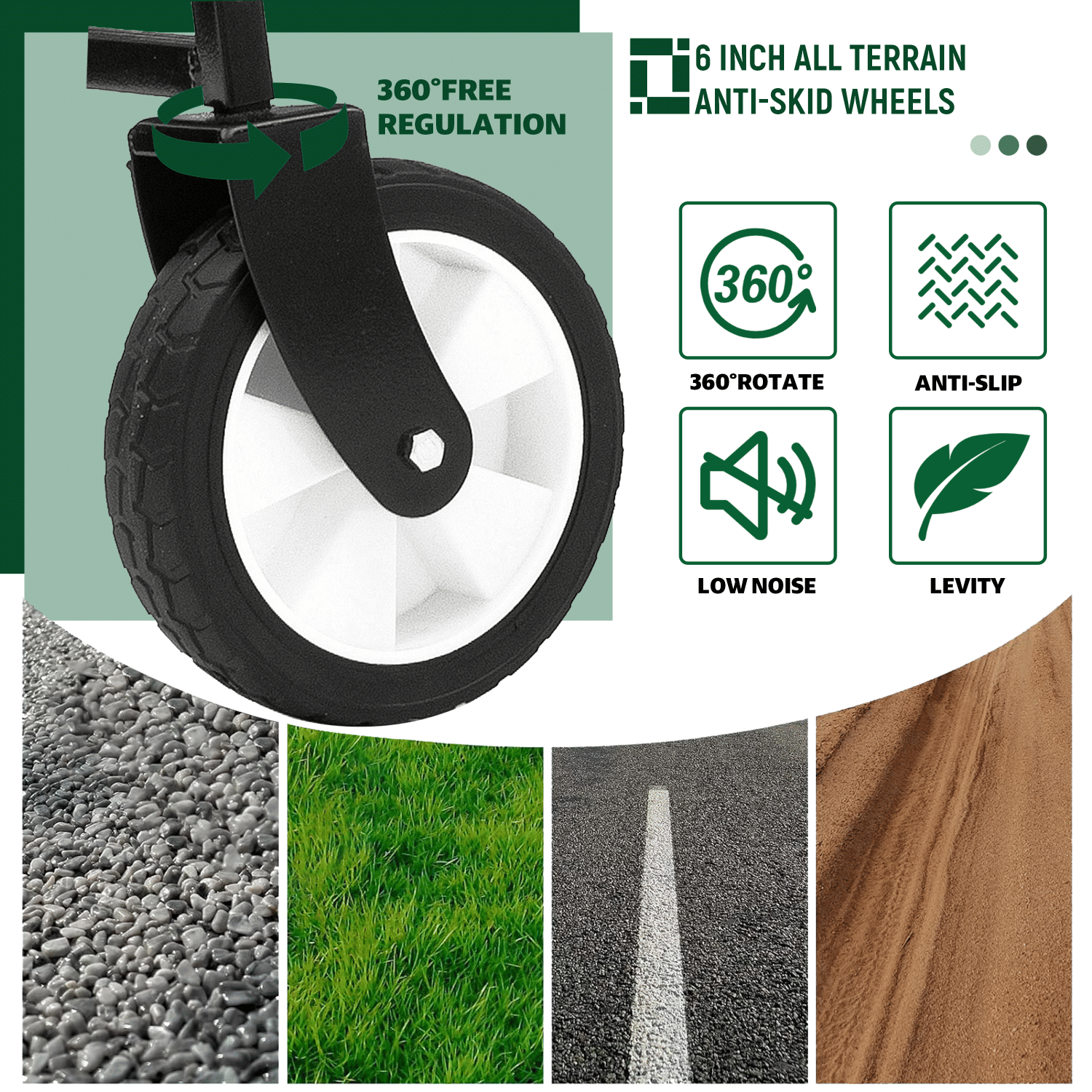 All-Terrain 360-Degree Swivel Wheels: Equipped with 6-inch wheels that can rotate 360 degrees, this cart is perfect for navigating various terrains, making it easy to maneuver on any surface.
